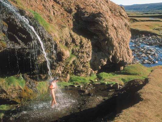 Two hours drive from Seyðisfjörður is Laugavalladalur. There you'll find a geothermal waterfall to play and bathe in.
